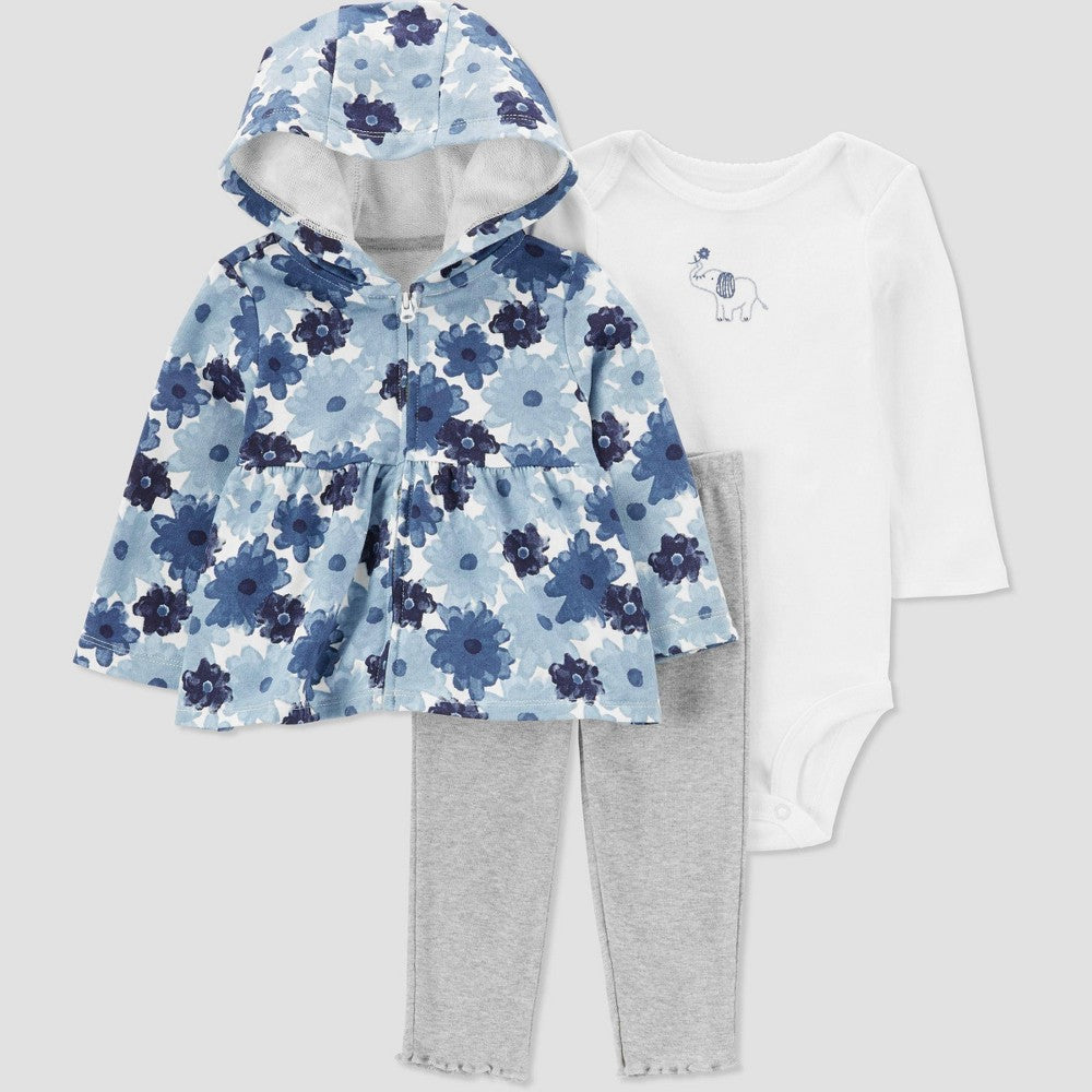 Baby girl gets comfort and style packed into one complete outfit with this 3-piece set by Carter's Just One You. Featuring a french terry floral cardigan, she's got adorable style while riding around with mommy. When playdates are indoors, unzip her hooded cardigan, and she can rock her elephant graphic bodysuit with her Gray pants. The cotton pants are cozy for baby girl and convenient for you when it's time for changes! Size: 3M. Color: blue. Gender: female. Age Group: kids.