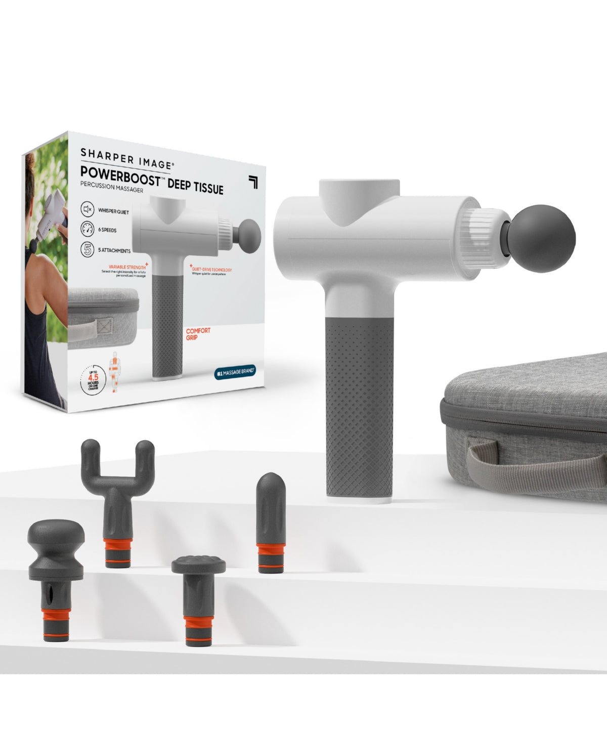 Sharper Image Powerboost Deep Tissue Percussion Massager 2.0 Rechargeable with 5 Attachments 6 Speed Settings White (Retail Price $129.99)