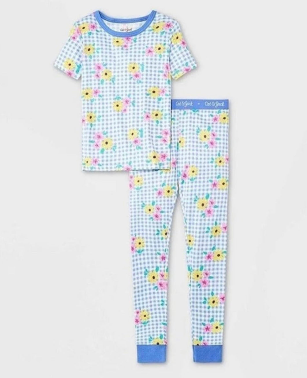 Girls' 2pc Gingham Floral 100% Cotton Snug Fit Pajama Set - Cat & Jack Blue. Size 8