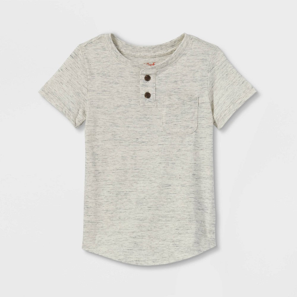 Coordinate his everyday laidback look with this Henley Short-Sleeve T-Shirt from Cat and Jack?. This short-sleeve T-shirt in a heathered finish makes a go-to staple to his casual wear. It features a two-button placket henley neck along with a chest pocket for classic style. The soft fabric lends comfy all-day wear. Have him wear this regular-fit tee tucked or untucked with any style of bottoms in his closet for versatile dressing options. Cat and Jack?: Classics with an imagination of their own. Color: Cream. Gender: male. Age Group: toddler. Pattern: Solid. Material: Cotton.